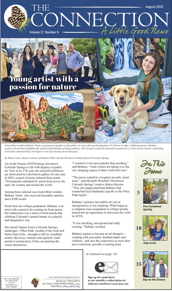The Connection shares inspiring stories, relevant news and timely information with our readers in the Castle Pines community and throughout Douglas County. We believe a community that stays connected and informed thrives, so we cultivate positive community relationships and connect resources via a monthly printed and mailed lifestyle newspaper and E Guide magazine (all things Eating, Entertainment, Events and Exercise), social media platforms and an extensive website. We celebrate neighbors, businesses and events, and having delivered "a little good news" for nearly two decades, we are a valued and trusted resource. The photos below are just a snapshot of some of the great stories in our current issue: