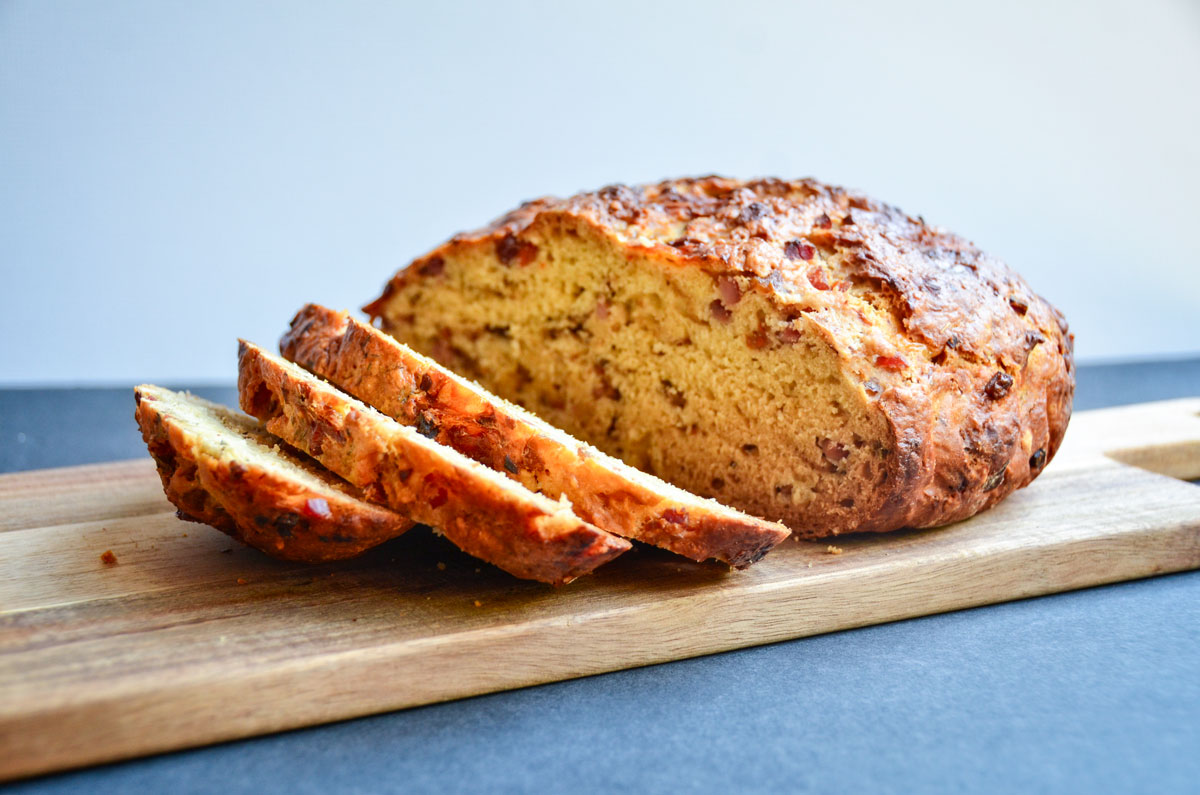 What I came up with differs enough from the original that I don’t feel comfortable calling this a ploughman’s loaf anymore, so I have dubbed it simply “ham and cheese bread.” In the spirit of the original, though, this is a quick rise bread that includes savory ham, cheese and sundried tomatoes. Because the bread uses baking soda rather than yeast for leavening, it comes together fast. The add-ins and herbs make it savory and satisfying. I have skipped the chutney altogether, though a schmear atop a warm slice would do the job without throwing off the moisture balance of the recipe.