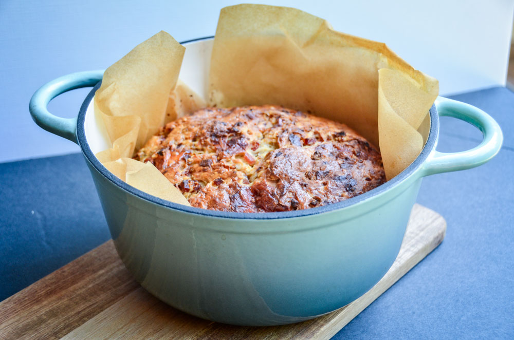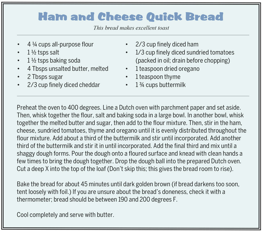Preheat the oven to 400 degrees. Line a Dutch oven with parchment paper and set aside. Then, whisk together the flour, salt and baking soda in a large bowl. In another bowl, whisk together the melted butter and sugar, then add to the flour mixture. Then, stir in the ham, cheese, sundried tomatoes, thyme and oregano until it is evenly distributed throughout the flour mixture. Add about a third of the buttermilk and stir until incorporated. Add another third of the buttermilk and stir it in until incorporated. Add the final third and mix until a shaggy dough forms. Pour the dough onto a floured surface and knead with clean hands a few times to bring the dough together. Drop the dough ball into the prepared Dutch oven. Cut a deep X into the top of the loaf (Don’t skip this; this gives the bread room to rise).