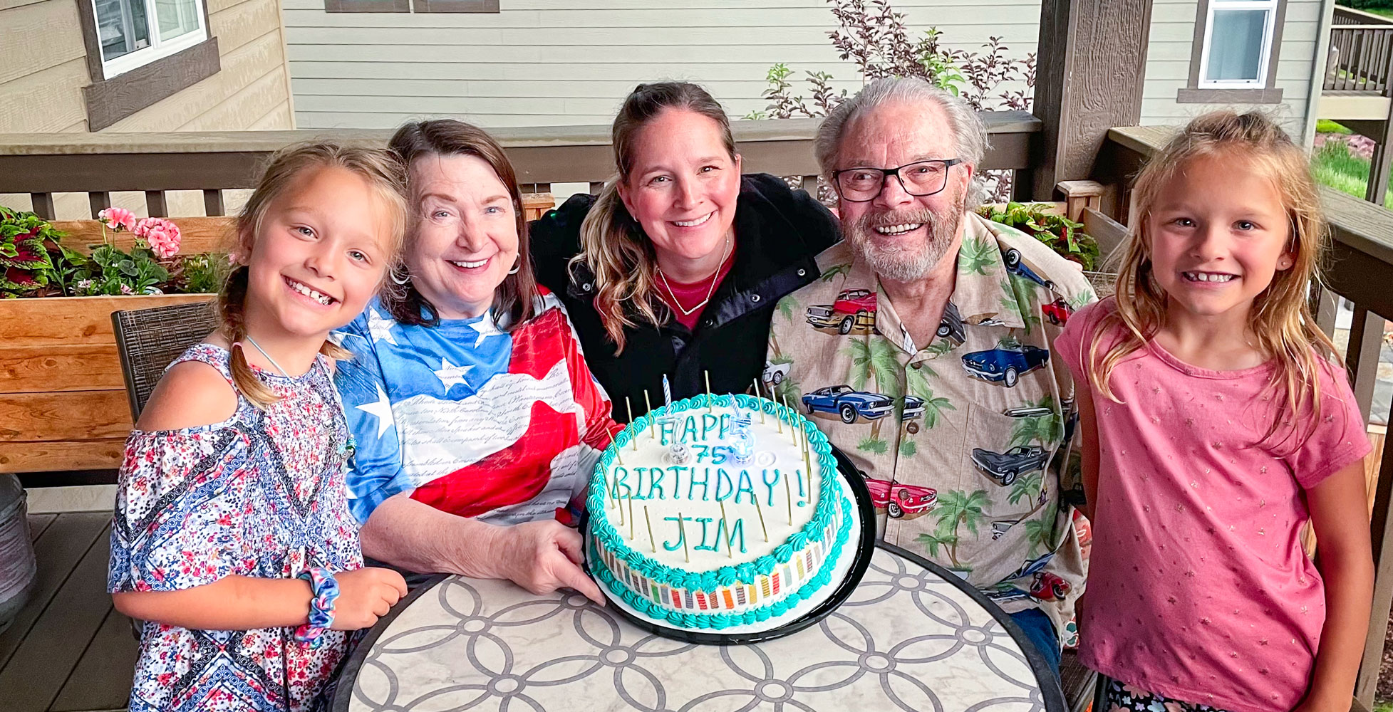 Jim Yank celebrating his 75th birthday with family. Left to right: Granddaughter Kaitlyn, Nancy, daughter Angela, Jim and granddaughter Catherine.