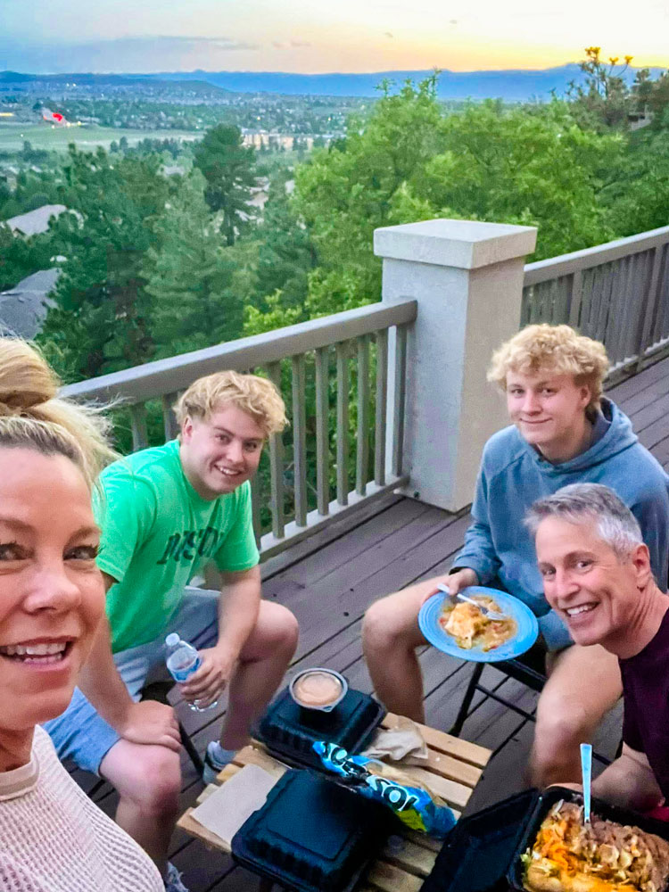 Left to right: Tristin, Luke, Nick and Dan Gleason enjoying their first meal on the deck of their new home in The Village at Castle Pines in June.