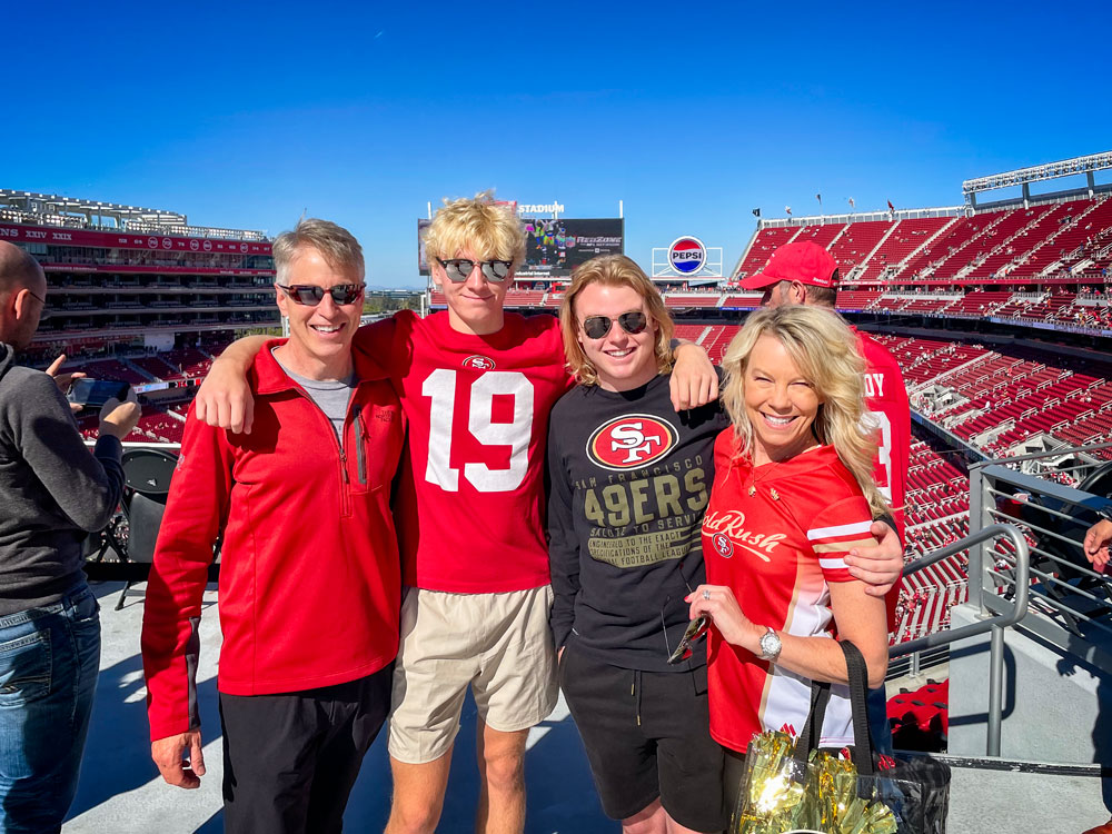Dan, Nick, Luke and Tristin Gleason at the San Francisco 49er alumni game in 2023.