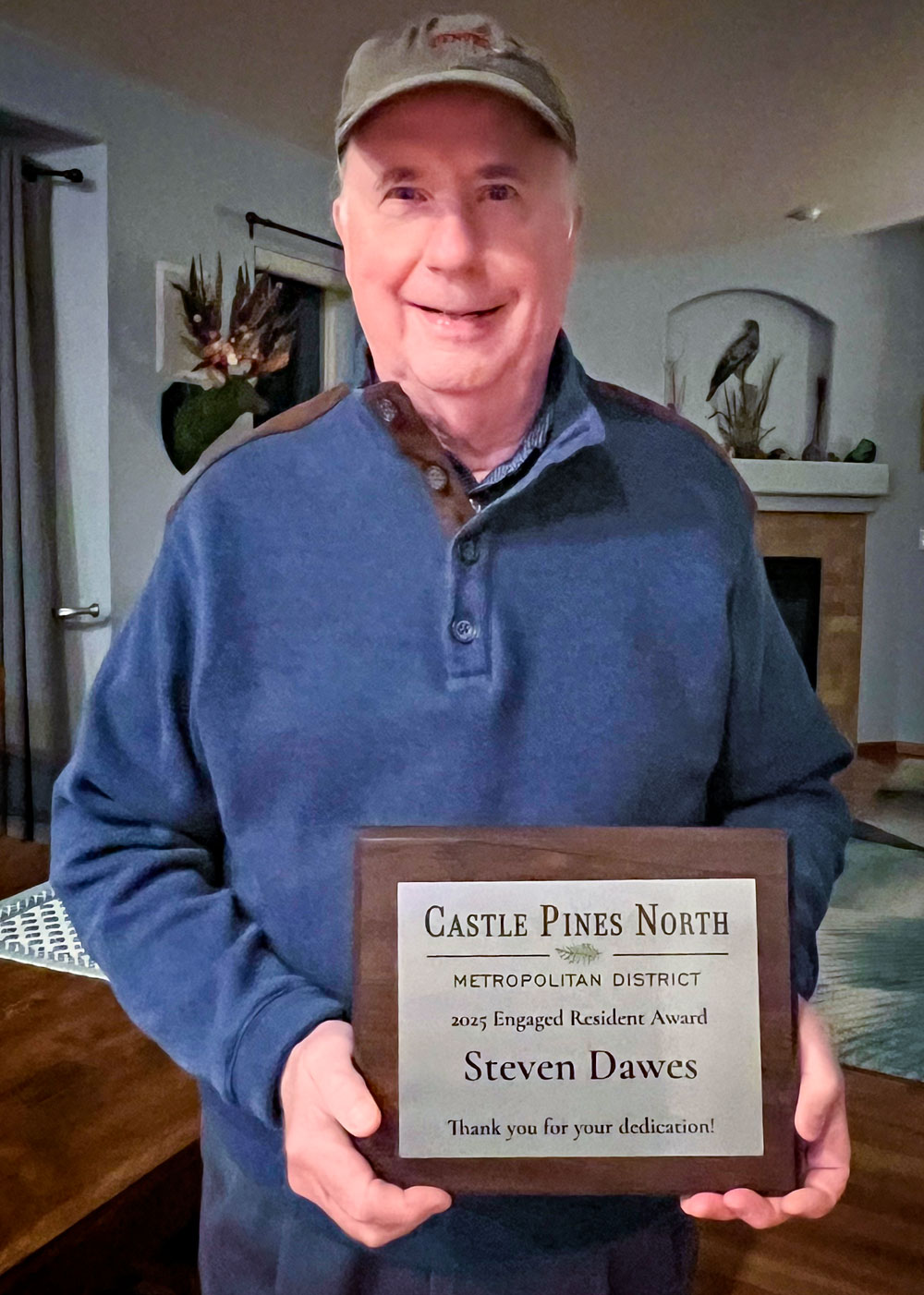 Steve Dawes could easily kick up his feet and relax with his wife, Roberta Allen, and enjoy their golden years at their home in Daniels Gate. He has earned it. But the former lawyer regularly attends the Castle Pines North Metro District (CPNMD) meetings, asking questions and lending insights. For the first time in CPNMD history, the organization recently recognized Steve for his diligence and awarded him “2025 Most Engaged Resident.”