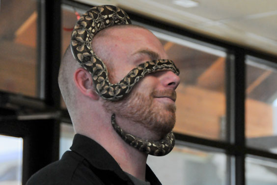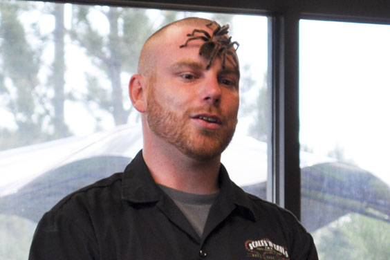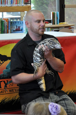 Mr. Chad was entertaining as he introduced tarantulas, lizards, snakes, a tortoise, a bullfrog and a scorpion to the kids. The animals were from all over the world: Madagascar, Australia, Asia, South and North America. The program was a great learning experience for the children as they saw first-hand how animals blend into nature. The group was in awe as Mr. Chad gently handled the animals while teaching about the unique characteristics of each creature. Little ones oohed, ahhed and laughed as the snakes, lizards and tarantula climbed and slithered over Mr. Chad, even inside of his shirt!