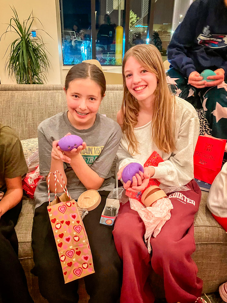 Two soccer teammates excited after opening Rainbow Mystery Dumplings they received from a teammate in a Valentine’s gift exchange.