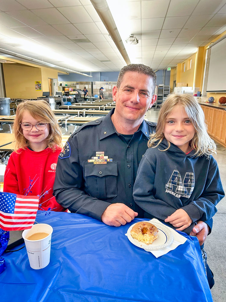 Justin Shipley with the Aurora Police Department enjoyed National First Responder Day breakfast with his daughters, Brooklyn (left) and Sadie (right), students at American Academy.