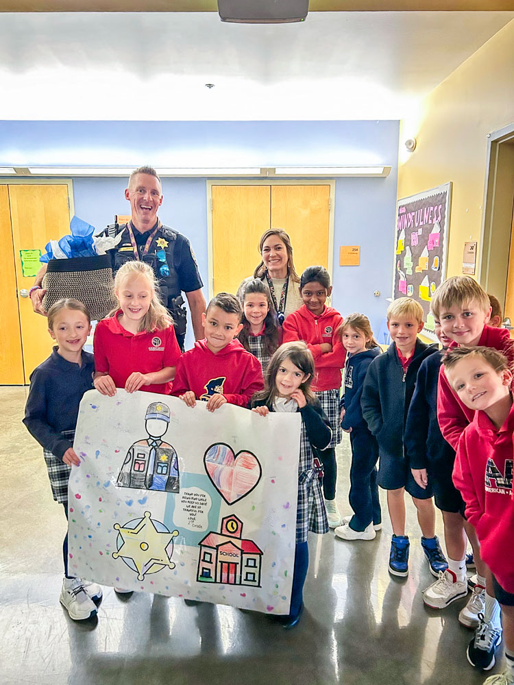 American Academy’s School Resource Office, Deputy Eric Rhymer, is honored by Sarah Thomasson and her second-grade class.