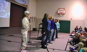 A few teachers came up to help act out some of the behaviors they would rather not see in the classroom, such as leaving trash all over and interrupting others. The third through fifth graders laughed and clapped as Klinkerman drilled their teachers, making the teachers salute and stand in a straight row.