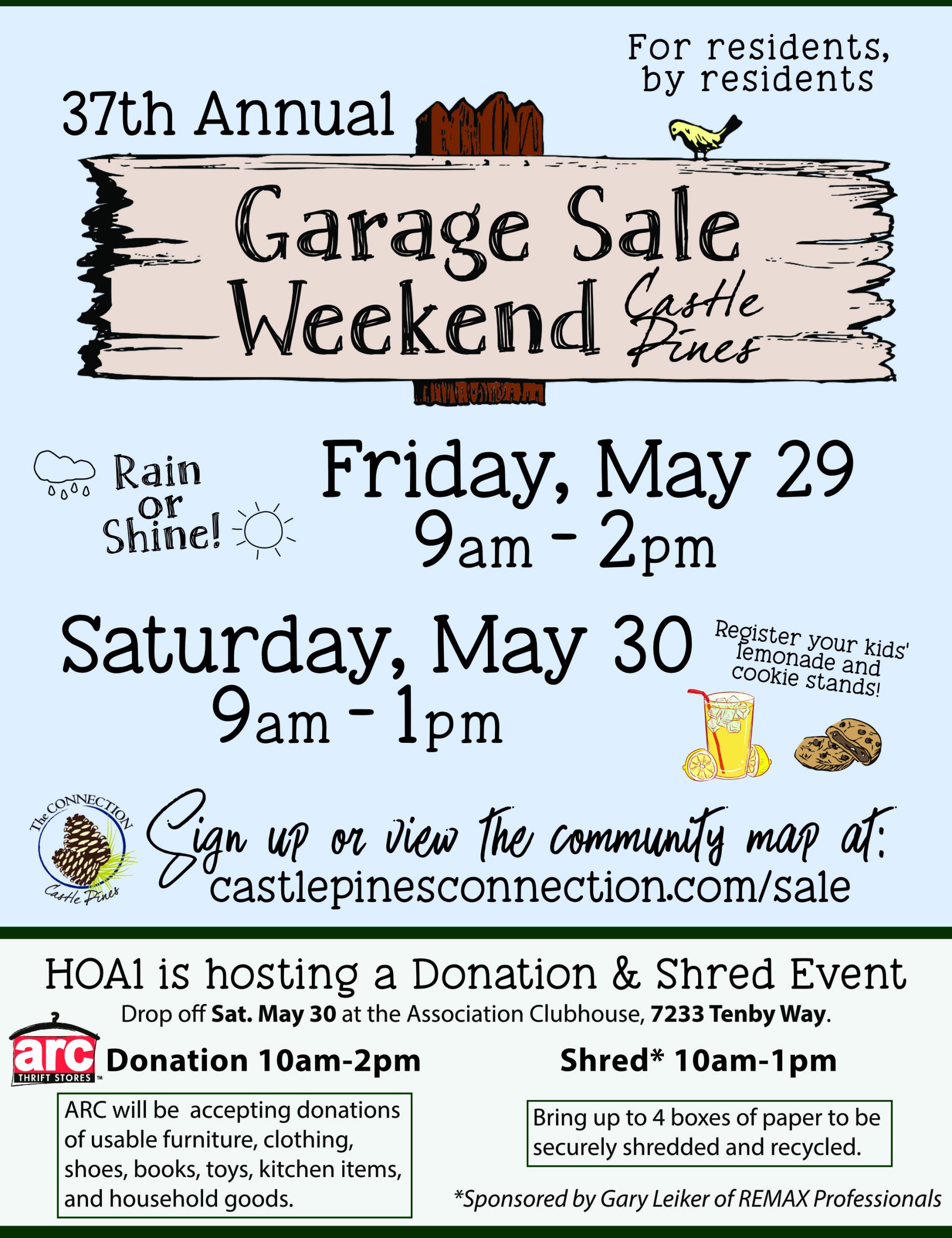 If you find yourself with items left over after the sale, HOA1 is hosting a Donation and Shred Event which is open to the community (sponsored by Gary Leiker of RE/MAX Professionals). As many as four boxes of paper can be brought to be securely shredded and recycled. All paper is accepted and can include staples or other metal such as hanging folders, as well spiral notebooks; but no three-ring binders.