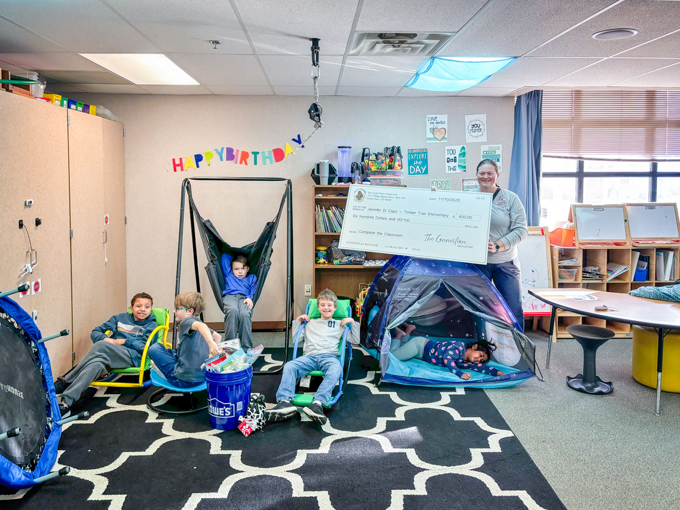 Timber Trail Elementary SSN teacher Jennifer Di Capo with her students and some of the classroom supplies she received from her Amazon wish list, including: a hanging hammock swing, calming sensory rocking chairs and swivel seat, and a dome tent playhouse.