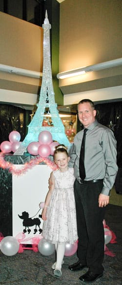Ooh, la la! Timber Trail Elementary girls were treated to a night on the town with their dads last month at the school’s annual Daddy-Daughter Dance. This year’s theme – “A Night in Paris” featured an Eiffel Tower, an Arc de Triomphe, and a village streetscape complete with a French café and flower shop. Dancers dined on cream puffs and croissants and admired replicas of art featured in famous French museums.