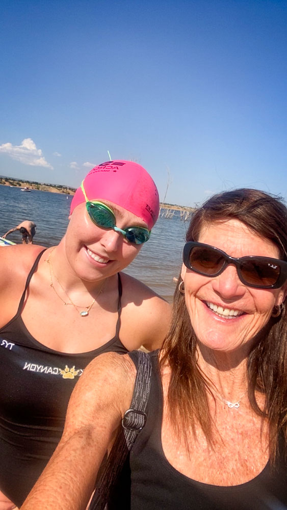 It was all smiles for Rock Canyon High School swimmer Lila Obrien and head coach Nicole Vanderpoel. Six swimmers participated in the Swim Across America event on August 23 at Chatfield Reservoir, raising money for pediatric cancer.