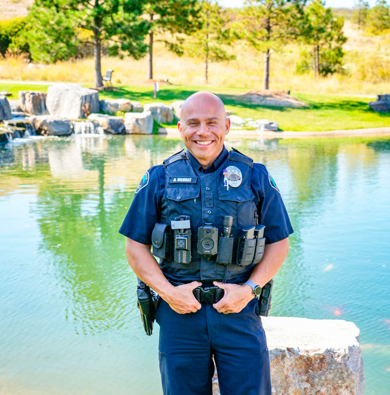 Faith, family, and fun fuel Master Police Officer Adrian Mendez. He enjoys time outside hiking, camping, off-roading and riding motorcycles, spending time with his family and taking care of those closest to him and his community. Adrian carries these passions into his work with the Castle Rock Police Department (CRPD). What was once a hobby, Adrian uses his drone pilot experience as part of a new program at CRPD: Drone as First Responder (DFR).