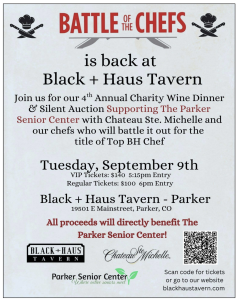 « All Events This event has passed. Battle of the Chefs September 9 @ 5:00 pm « Coffee Chat Tuesday Animals Around the Rock Series – Batty About Castle Rock » Add to calendar Google Calendar iCalendar Outlook 365 Outlook Live Details Date: September 9 Time: 5:00 pm Event Categories: CO, Douglas County, Food & Tasting, Fundraiser, Parker Event Tags:Battle of the Chefs Fundraiser at Black + Haus Tavern, Battle of the Chefs at Black + Haus Tavern, Battle of the Chefs in Parker, Parker Senior Center Events, Parker Senior Center Fundraiser Website: https://www.blackhaustavern.com/events/4th-annual-charity-wine-dinner-benefitting-the-parker-senior-center Venue Black + Haus Tavern 19501 Mainstreet #100 Parker, CO 80138 + Google Map Related Events Tree Lighting Celebration December 5 @ 5:00 pm - 7:00 pm BRE Winter Wonderland Market December 6 @ 10:00 am - 3:00 pm Santa in the Pines December 6 @ 11:00 am - 2:00 pm