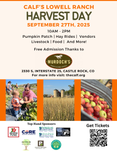 « All Events This event has passed. Harvest Day September 27 @ 10:00 am - 2:00 pm « Slash Collection Day Walking Tour of Downtown Castle Rock » Add to calendar Google Calendar iCalendar Outlook 365 Outlook Live Details Date: September 27 Time: 10:00 am - 2:00 pm Event Categories: CO, Castle Rock, Douglas County, Educational, Fall Festival, Family event, Farmer's Market, Free Day, Fun, Fundraiser, Outdoors Event Tags:Agriculture events in Castle Rock, Agriculture events in Douglas County, CALF's Lowell Ranch Events, Fall Festival's in Colorado, Fall Festivals in Castle Rock, Free Family events in Castle Rock, Free Family events in Douglas County Colorado, Harvest Day at Lowell Ranch in Castle Rock Website: https://www.thecalf.org/harvest-day.html Venue CALF’S Lowell Ranch 2330 I-25 Castle Rock, CO 80104 + Google Map Related Events Tree Lighting Celebration December 5 @ 5:00 pm - 7:00 pm BRE Winter Wonderland Market December 6 @ 10:00 am - 3:00 pm Santa in the Pines December 6 @ 11:00 am - 2:00 pm