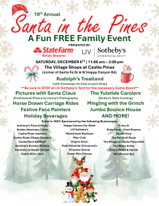 « All Events Santa in the Pines December 6 @ 11:00 am - 2:00 pm « BRE Winter Wonderland Market Reindeer Games » Add to calendar Google Calendar iCalendar Outlook 365 Outlook Live Details Date: December 6 Time: 11:00 am - 2:00 pm Event Categories: CO, Castle Pines, Christmas, Douglas County, Family event, Free Day, Fun, Holiday event Event Tags:Free Family Holiday event in Castle Pines, Holiday event in Castle Pines, Santa in Castle Pines, Santa in the Pines Venue The Village Shops at Castle Pines Related Events Winter Wonderland December 5 - December 14 Event Series Festival Park Starlight Market December 5 - December 6 Tree Lighting Celebration December 5 @ 5:00 pm - 7:00 pm