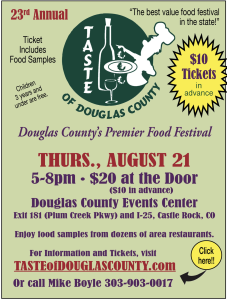 « All Events This event has passed. Taste of Douglas County August 21 @ 5:00 pm - 8:00 pm « Jazz in the Park Tunes for Trails/Perks for Parks » Add to calendar Google Calendar iCalendar Outlook 365 Outlook Live Details Date: August 21 Time: 5:00 pm - 8:00 pm Event Categories: CO, Castle Rock, Douglas County, Food & Tasting Event Tags:Annual Taste of Douglas County, Food Tasting in Castle Rock, Taste of Douglas County, Taste of Douglas County Colorado, Taste of Douglas County in Castle Rock Website: https://www.tasteofdouglascounty.com/ Venue Douglas County Fairgrounds & Event Center 500 Fairgrounds Road Castle Rock, CO 80104 United States + Google Map View Venue Website Related Events Tree Lighting Celebration December 5 @ 5:00 pm - 7:00 pm BRE Winter Wonderland Market December 6 @ 10:00 am - 3:00 pm Santa in the Pines December 6 @ 11:00 am - 2:00 pm
