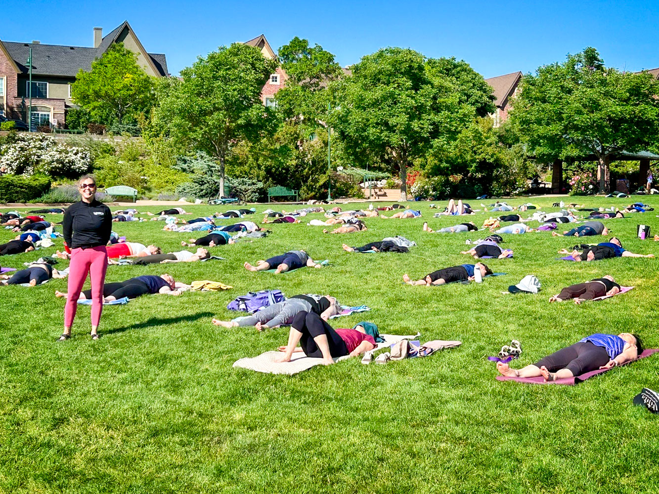Elizabeth Potarf teaching an outdoor yoga class where participants are in savasana (corpse pose), a deeply relaxing final yoga posture.