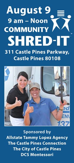 Secure document shredding, provided by Shred-It, will be available free of charge to the Castle Pines community on Saturday August 9 from 9 a.m. until noon at the DCS Montessori School.