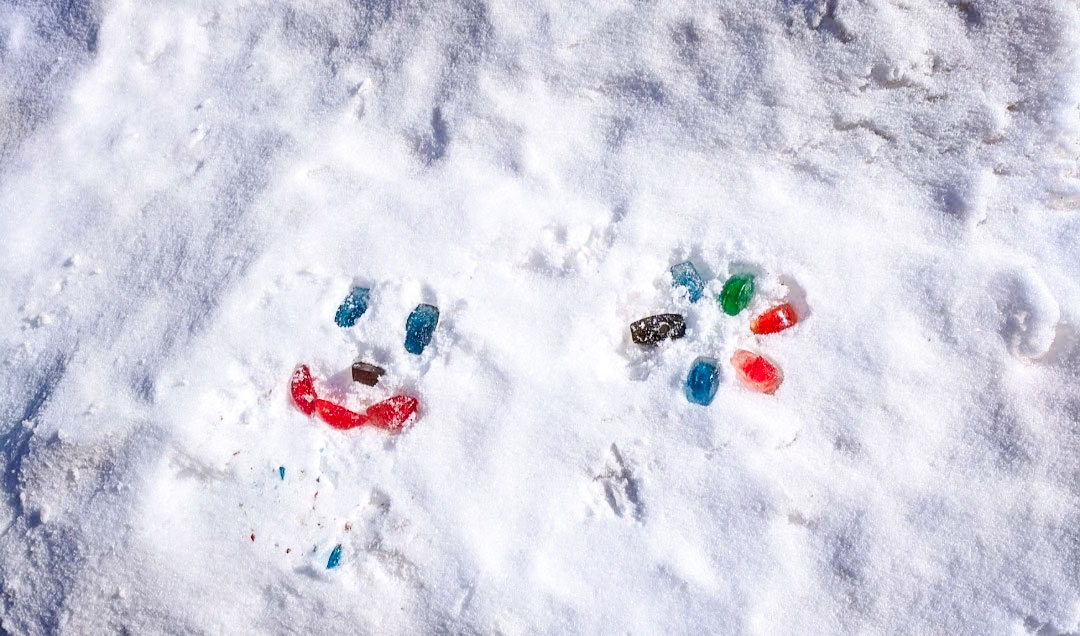 Neighbor kids are having fun with ice jewels, making faces and snow painting with accents of color.