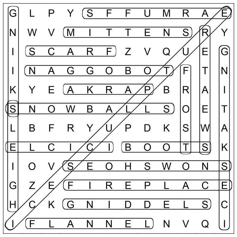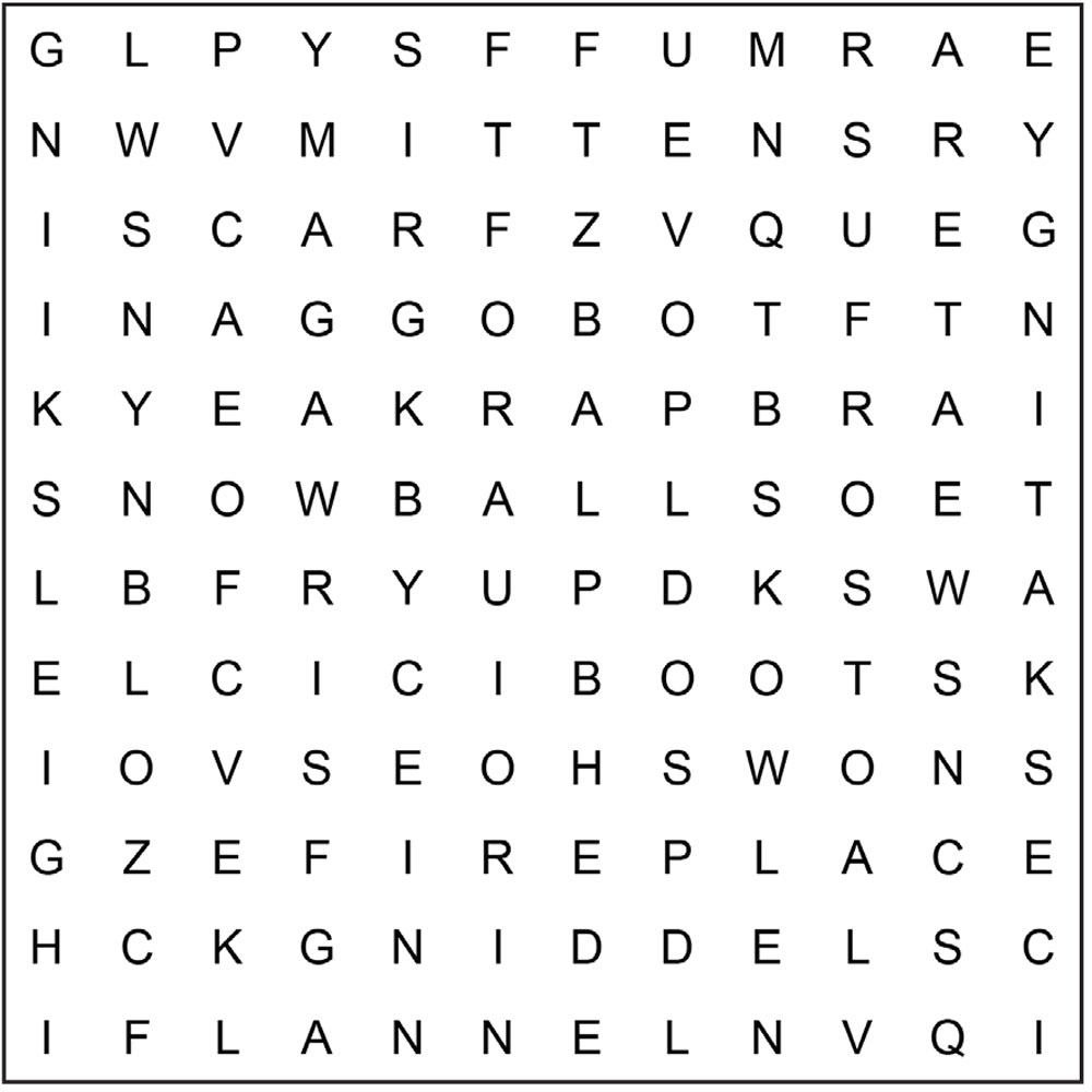 In the puzzle, find and circle these “wintery fun” words. Words can be horizontal, vertical, or diagonal, and forward or backward.