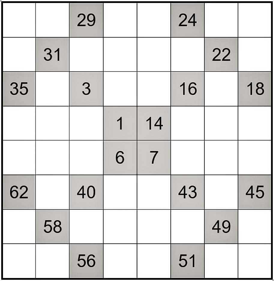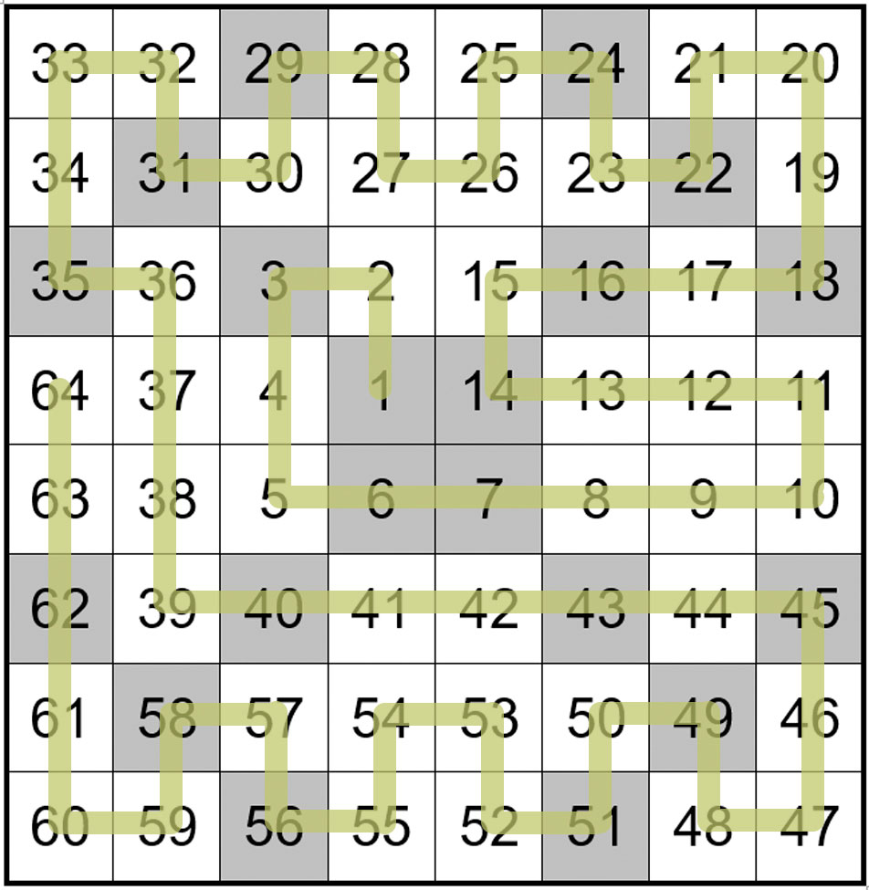 Fill in the white squares with the missing numbers, in numerical order 1 to 64, to form a single continuous path that does not cross itself and never runs diagonally.