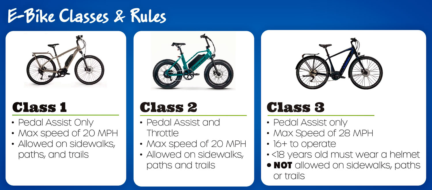 Class 1 and Class 2 e-bikes have pedal assist with a maximum speed of 20 mph and can be operated on sidewalks, paths and trails (Class 2 e-bikes have a throttle in addition to pedal assist).