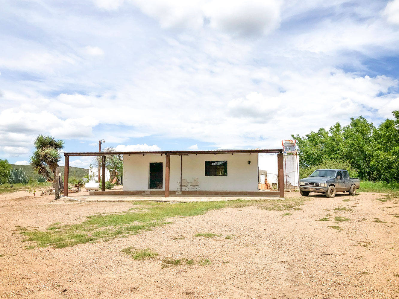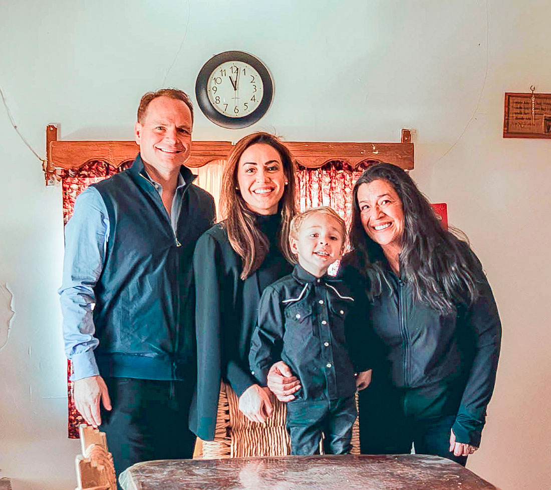 Mark and Jo Brinkerhoff with their son Os and Jo’s mother at Jo’s modest 800-square-foot childhood home (below) in Mexico.