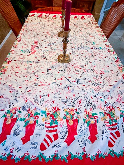 The Christmas tablecloth is a tradition that started with Shara’s grandmother. The family has been signing and dating the tablecloth as they enjoyed their holiday meals since 1957.
