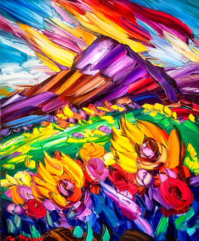 Today, Greg is solely a professional painter, working in his home studio. He uses his own “wet on wet” oil painting technique to bring landscapes to life. His color palette is daringly original, and his method is unique to his spontaneous creativity. Using a large palette knife, Greg crafts scenery with brightly colored gestural swipes, layering paint until the image comes to life—full of physical texture and light.