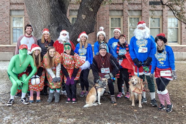 All participants wear a holiday-themed costume and tie jingle bells to their shoe laces, creating a fun, festive race. The Castle Pines group wore costumes that included a santa suit, a morphsuit, wrapped presents, and various holiday socks and hats.