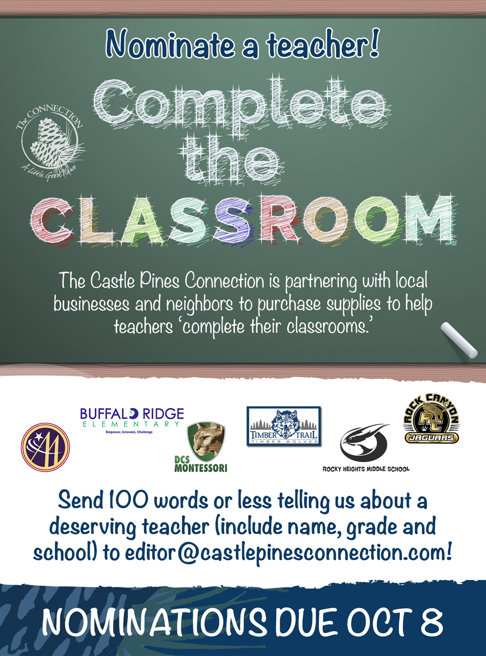 If you would like to nominate a favorite teacher from American Academy, Buffalo Ridge Elementary, DCS Montessori, Timber Trail Elementary, Rocky Heights Middle School or Rock Canyon High School for us to complete their classroom, send an email to editor@castlepinesconnection.com briefly telling us why that teacher is awesome. Indicate the teacher’s name, grade and school. Nominations are due by September 30. We will pool the nominations, draw winners and feature the selected teachers in the November issue.