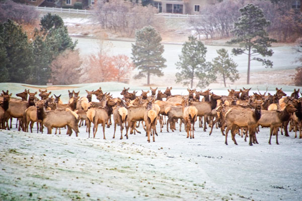 The Castle Pines community has many amenities to offer residents, including natural trails, breathtaking views and a variety of wildlife. Neighboring Cherokee Ranch & Castle is home to roughly 1,000 elk. As fall turns to winter, vegetation for the local herd is scarce, which is why residents have been catching glimpses of the elk grazing on the greens at The Ridge golf course and crossing roads in the community. The greater Castle Pines area is considered the winter range for the herd. A winter range is an area that animals use during the winter months to find food, water and cover from predators. The elk are expected to be in and around the community through March, or until the weather breaks for spring.
