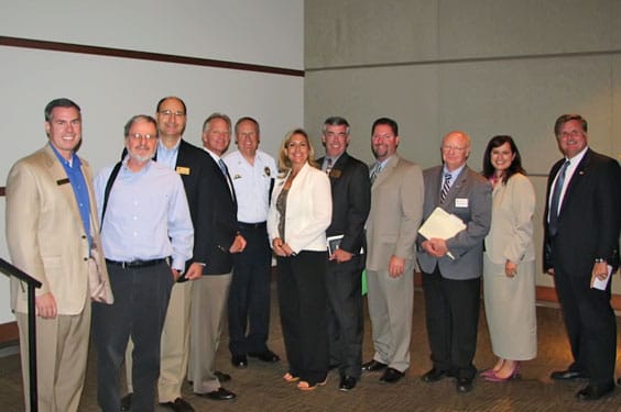 Pictured left to right: Justin Williams – Douglas County School District, Jim Frye – Colorado Union of Taxpayers secretary (lone speaker in favor of 60, 61 & 101), Jim Gunning – Lone Tree mayor, Rick Reiter – campaign director for Coloradans for Responsible Reform, Dan Qualman – South Metro Fire Rescue chief, Jill Repella – Douglas County Board of County Commissioners, Jeff Huff – City of Castle Pines North mayor, Dean Murphy – American Civil Constructors – representing the private sector, Jack Arrowsmith – Douglas County Clerk & Recorder, Ann Terry – Special District Association of Colorado executive director, and David Weaver, Douglas County sheriff.