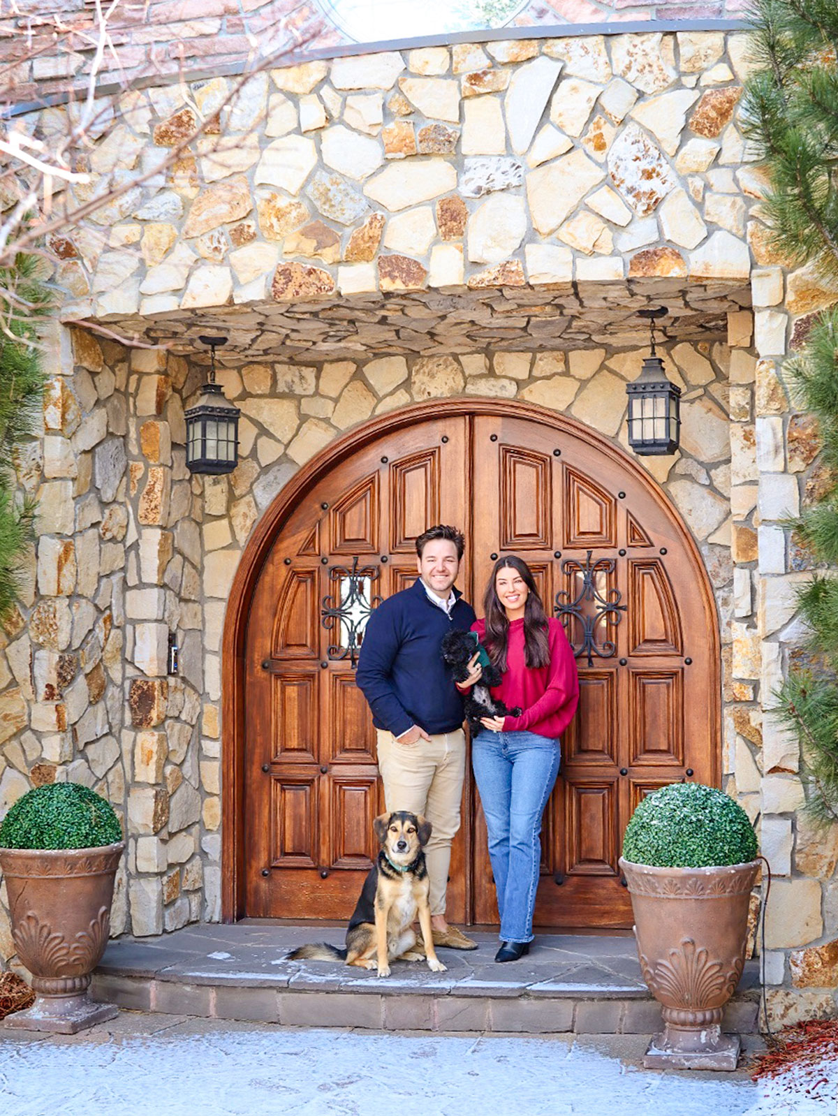 First family pic of the Roths: Mitchell and Chiersten with dogs Benny and Newman in front of their new home in the Village.
