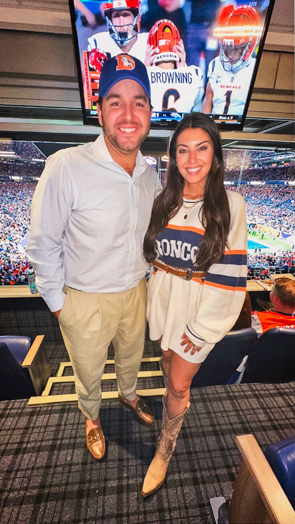 Mitchell and Chierstin Roth cheering on the Broncos against Cincinnati at Mile High Stadium last year.