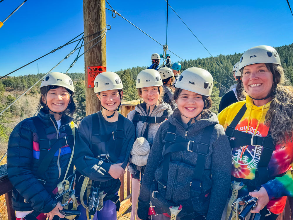 Campers preparing for ziplining, a highlight of the Stone Canyon Outdoor EdVentures experience.