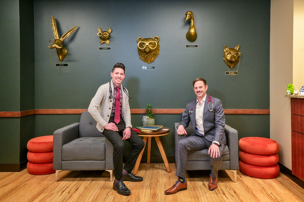 Aaron Block, M.D. (right) and John Waters (left) opened The Cove Concierge Medicine in Castle Rock in 2024. The golden heads on the wall are characters from Canadian author Jessica Hiemstra. Dr. Block and John consider them “our Cove Guardians” as they bring a sense of nature and wonder to the waiting room.