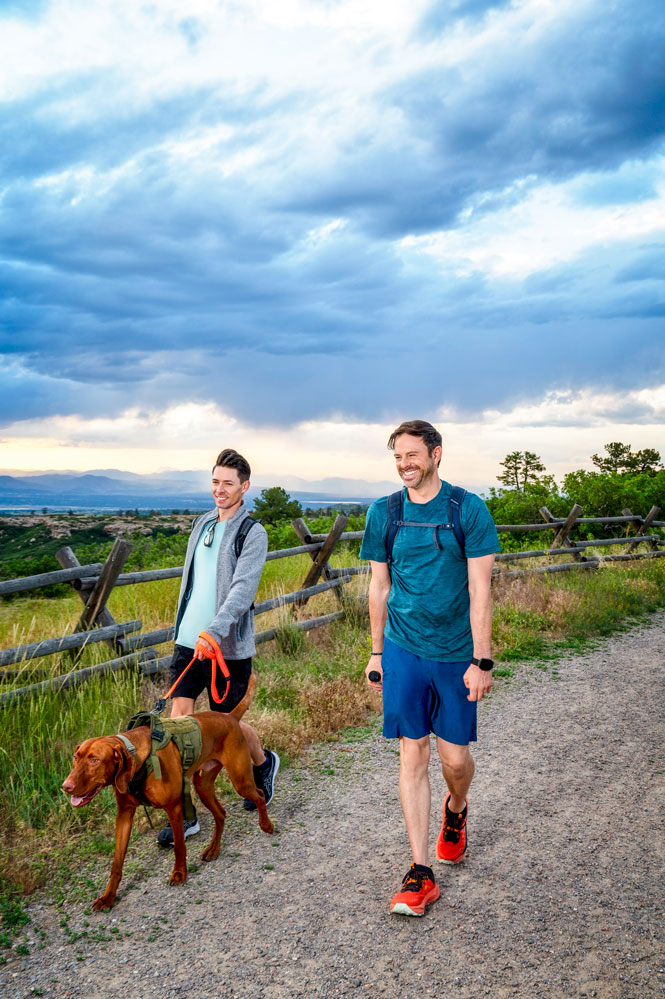 Aaron Block, M.D. and his husband and business partner, John Waters, nurse practitioner, take a walk through Daniels Park with their dog, Ranger. The couple loves the outdoors and living in Douglas County.