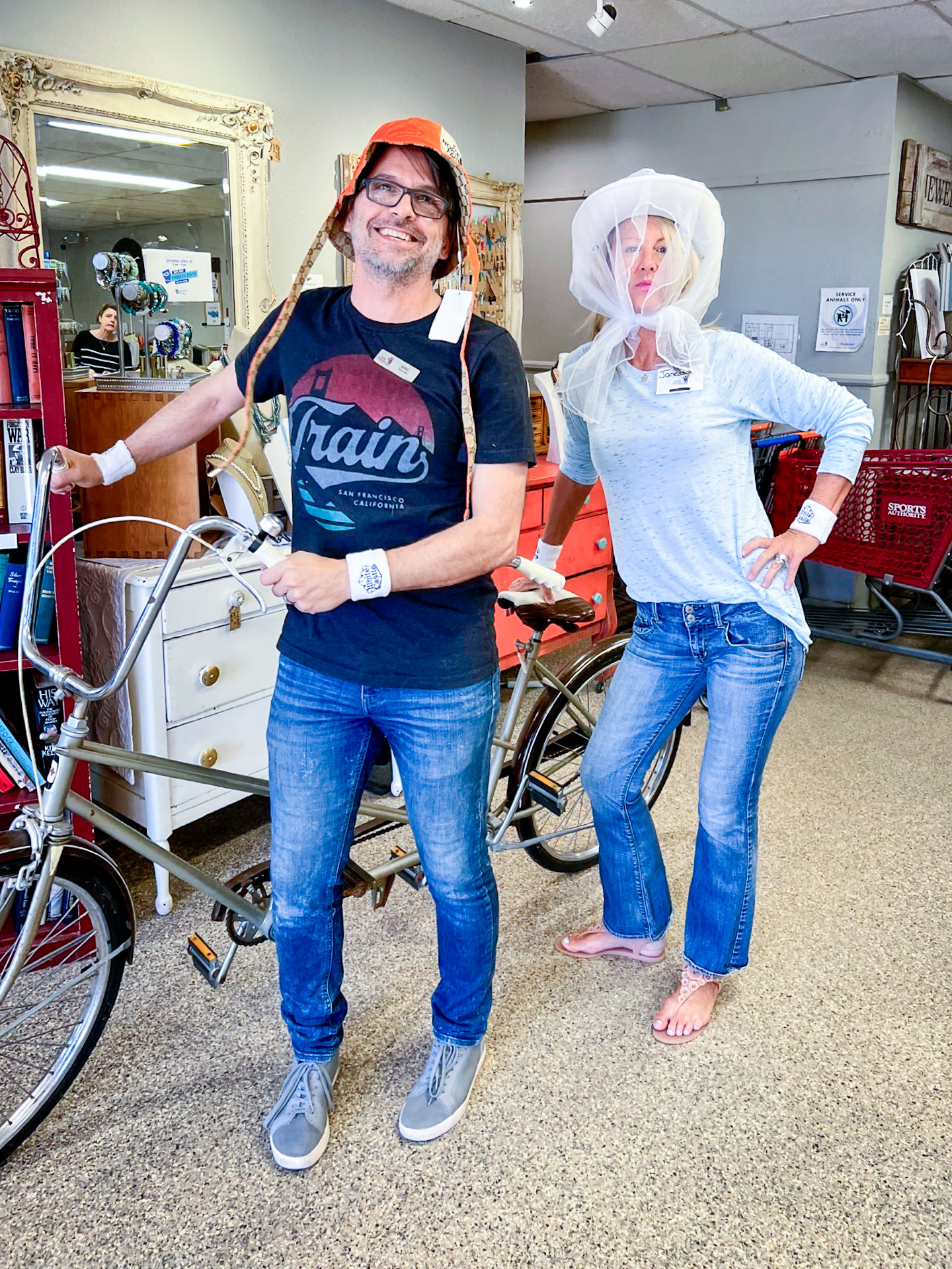 Help &Hope volunteers Eric Coronis and Janessa Runyan having some fun at Treasures Thriftique before taking this tandem bike out for spin in the parking lot.