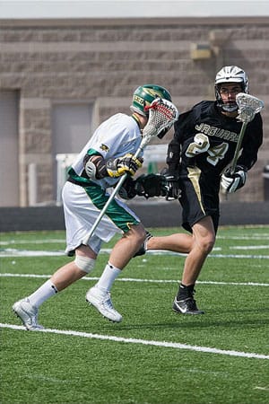 CPN resident Chad Spath (#24) of the Rock Canyon Jaguars battles a Mountain Vista player during the March 18 game. CPN resident Andrew Paredes is assistant coach of the Mountain…