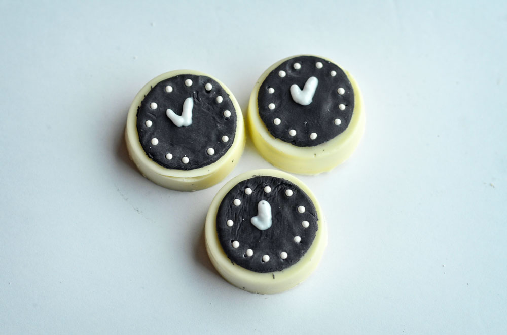 Cookie Clocks Article and photo by Lisa Crockett Ingredients: 6 ounces white molding chocolate 12 chocolate sandwich cookies (such as Oreo) Tube of prepared white decorator icing 3 ounces black…