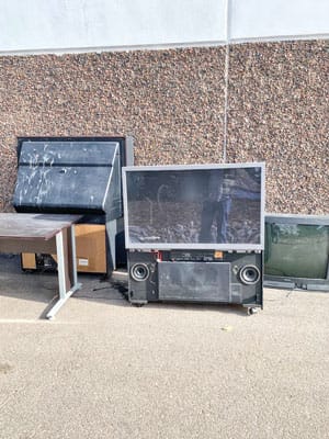Stacked up old TVs and a computer table left outside the Help & Hope Center after hours. These items will cost the Center several hundred dollars to recycle them using…