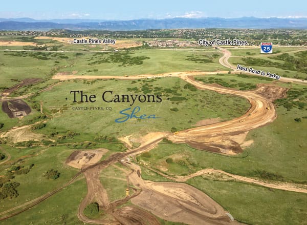This aerial photo taken looking west shows the development progess happening in the City of Castle Pines on the east side of I-25. The grading is initial infrastructure for the…