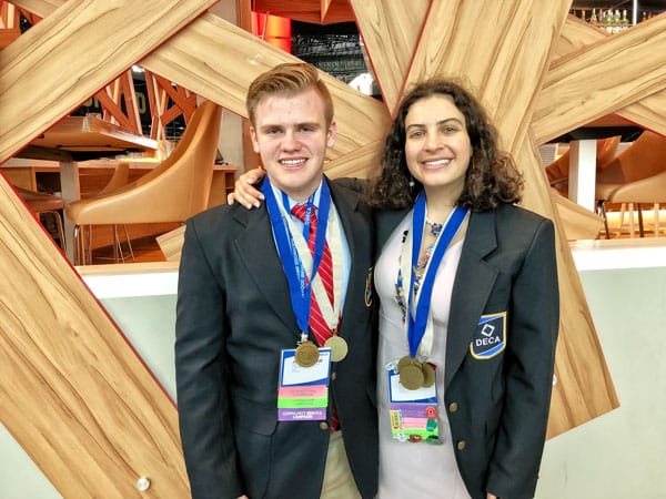 Jack Gebhardt (left) and Maria Pangolos (right) both earned top honors at the DECA world championship. Rock Canyon High School students at the DECA world championship in Atlanta, Georgia. From…