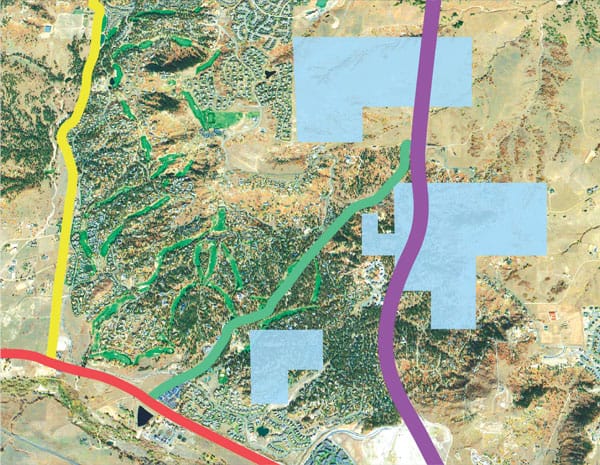 Map of the 1937 Chase Landholdings (in blue). I-25 is highlighted purple, Santa Fe (Hwy 85) is red, Happy Canyon Road is green and Daniels Park Road is yellow. By…