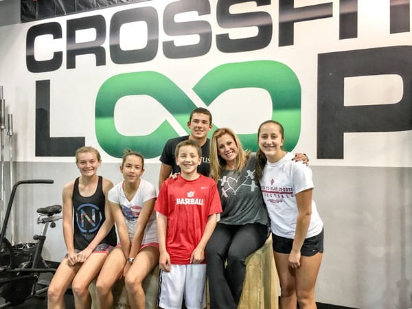 CrossFit Loop Castle Rock teens pausing for a moment in their CrossFit class. From left to right: Riley James, Julia Terry, Gabe Ziegler (CP), Jack Terry, Crossfit Coach Courtney Grant,…
