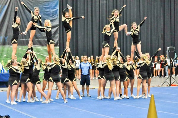 Above and below: Rock Canyon High School (RCHS) varsity cheer at the Universal Cheerleaders Association (UCA) Southern Colorado Regionals on October 31 in Pueblo where they won the super varsity…