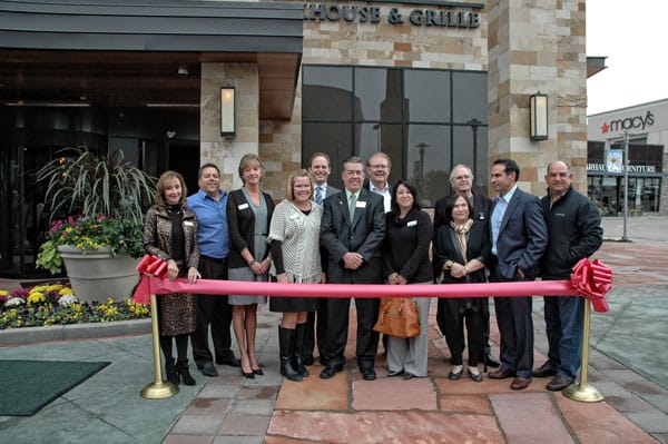 Members of the Castle Pines Chamber of Commerce gather with Castle Pines Mayor Jeff Huff (center) and restaurant owner Chris Perry (second from right) to celebrate a ribbon cutting ceremony…
