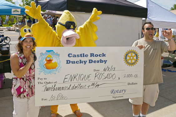 Read MoreDucky Derby Chairperson Kelly Marsh (left) presented the $2,000 first place cash prize check to Enrique Rosado (right). By Elizabeth Wood West; photo courtesy of Rotary Club of Castle Rock…
